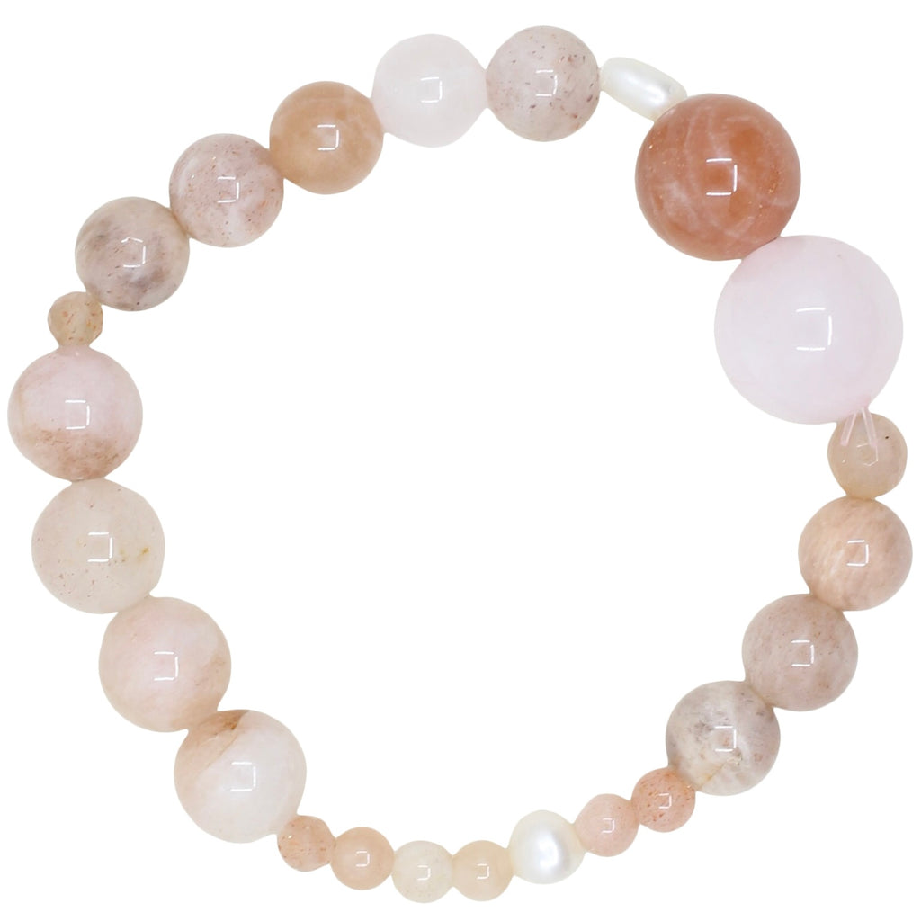Materialer: Armbåndet er fremstillet af ædelsten: opal og rose quartz sten ( 3-12 mm) og ferskvandsperler. Mål: Armbåndet passer til en håndleds omkreds fra ca. 15 til 16 cm.