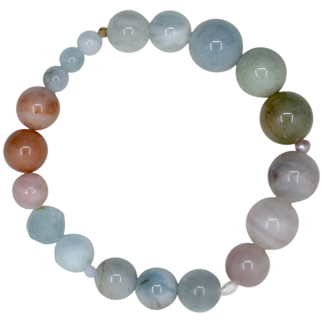 Materialer: Armbåndet er fremstillet af ædelsten i smukke pastelfarver ( 3-12 mm) og ferskvandsperler. Mål: Armbåndet passer til en håndleds omkreds fra ca. 15 til 16 cm.